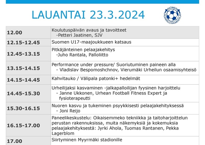 Suorituskyky teemasta saadaan alustamaan mm. tanskalaisen huippuseura FC Midtjyllandin suorituskyky-yksikön vetäjä Niklas Virtanen ja HJK:n Kansallisen liigan suorituskykyvalmentaja Liisa-Maija Rautio.